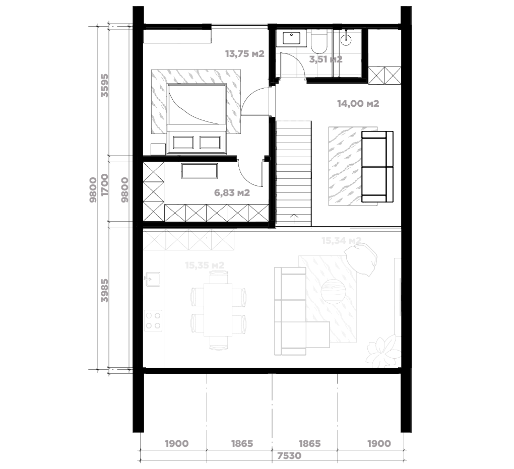 Кровля: фальц (RAL 7024), водосточная система